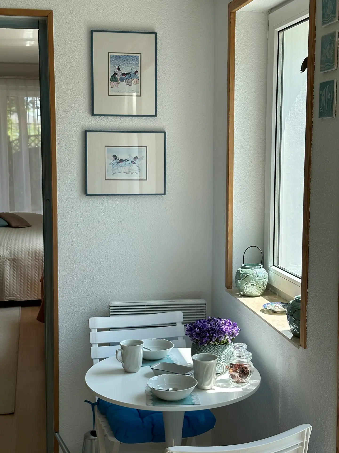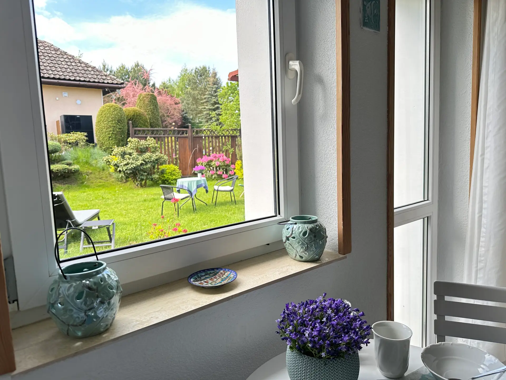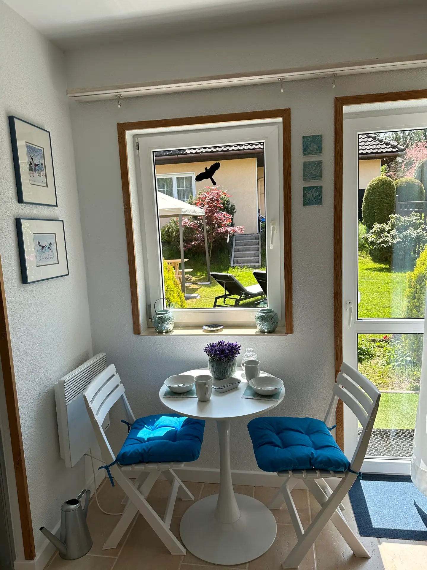 mały stolik bistro i dwa krzesła. Bezpośrednie wyjście do ogrodu.
