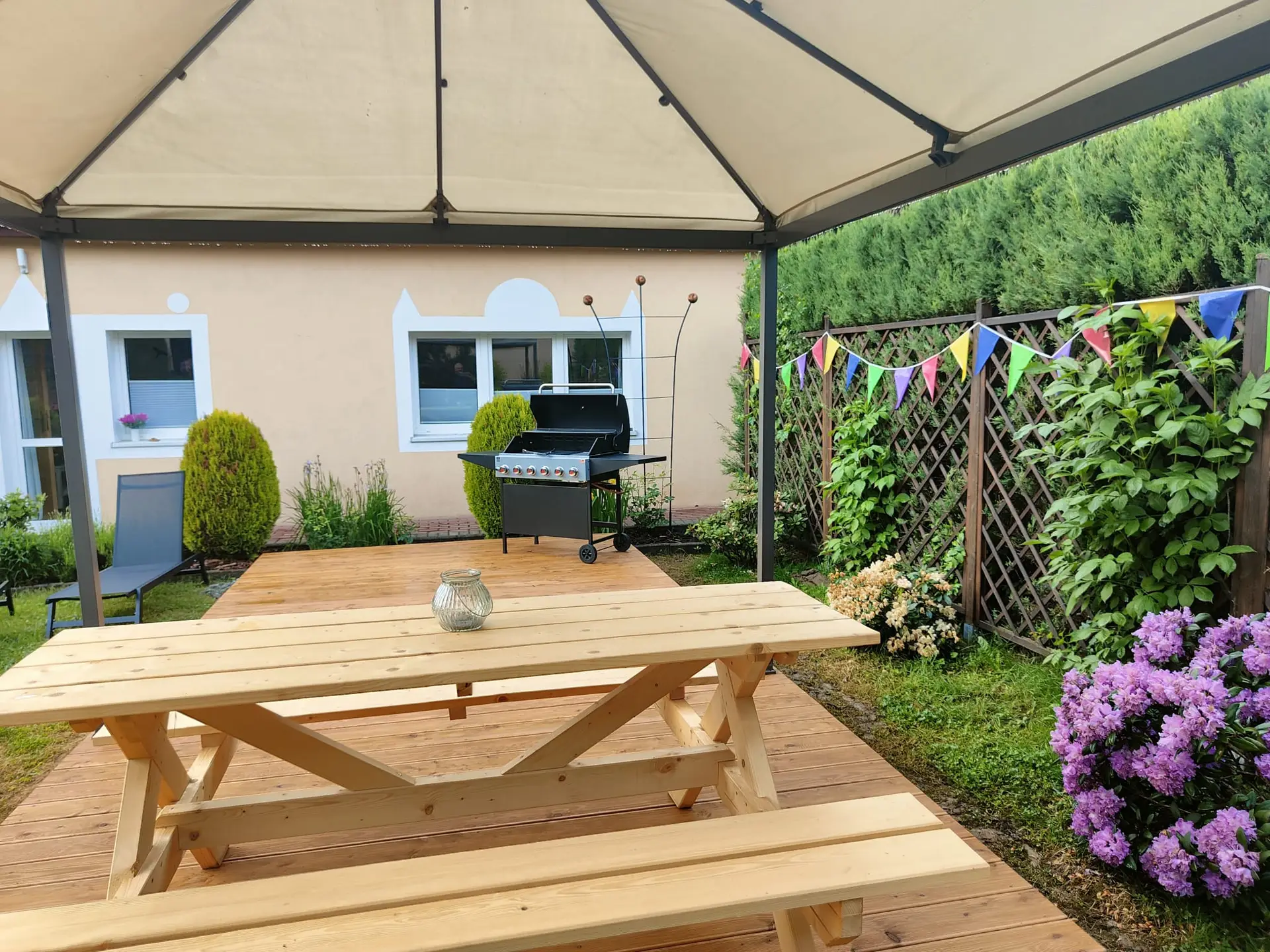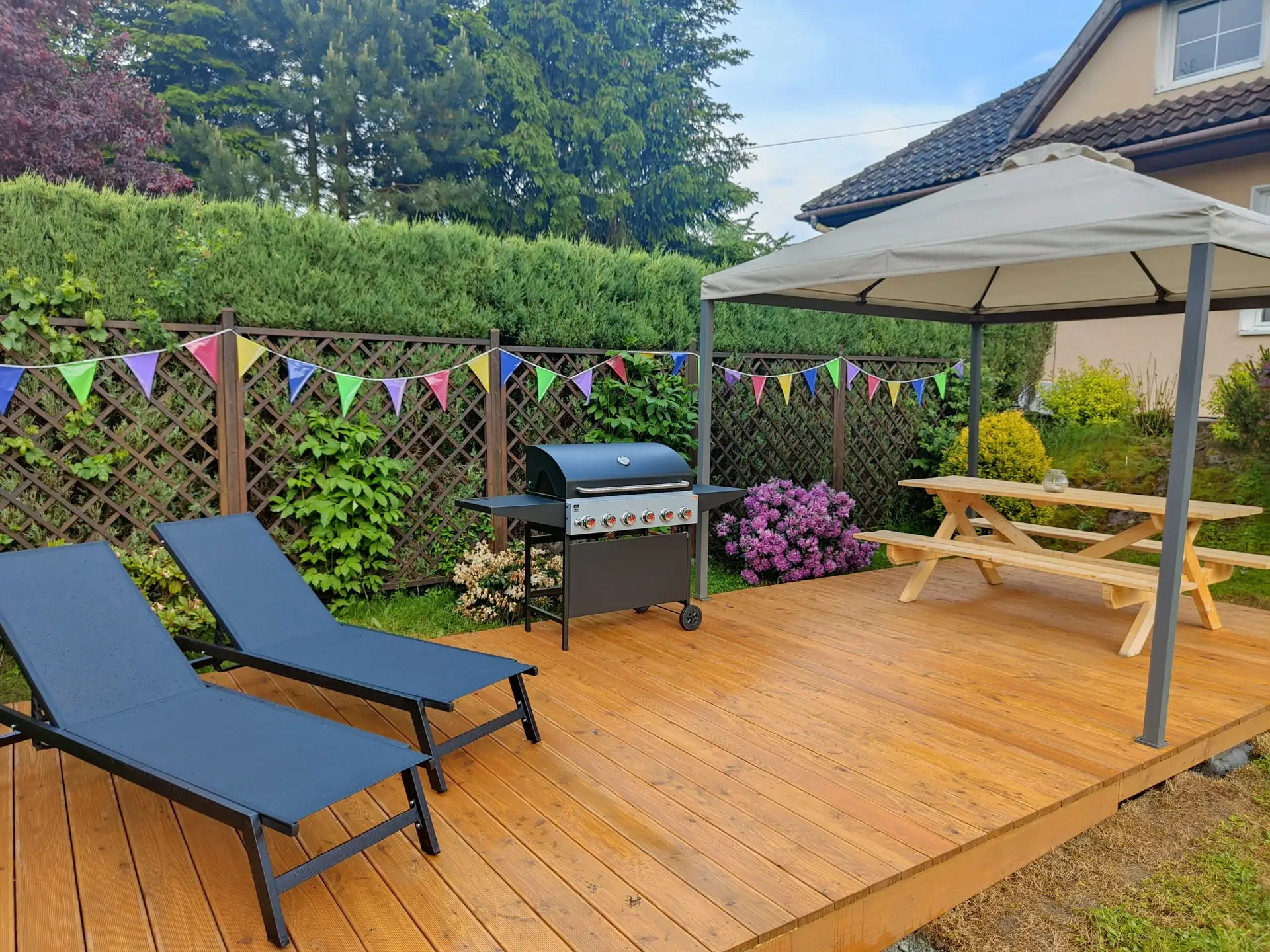 - Korzystanie z zadbanego ogrodu z oczkiem wodnym, grillem, miejscem na ognisko i stołem ogrodowym