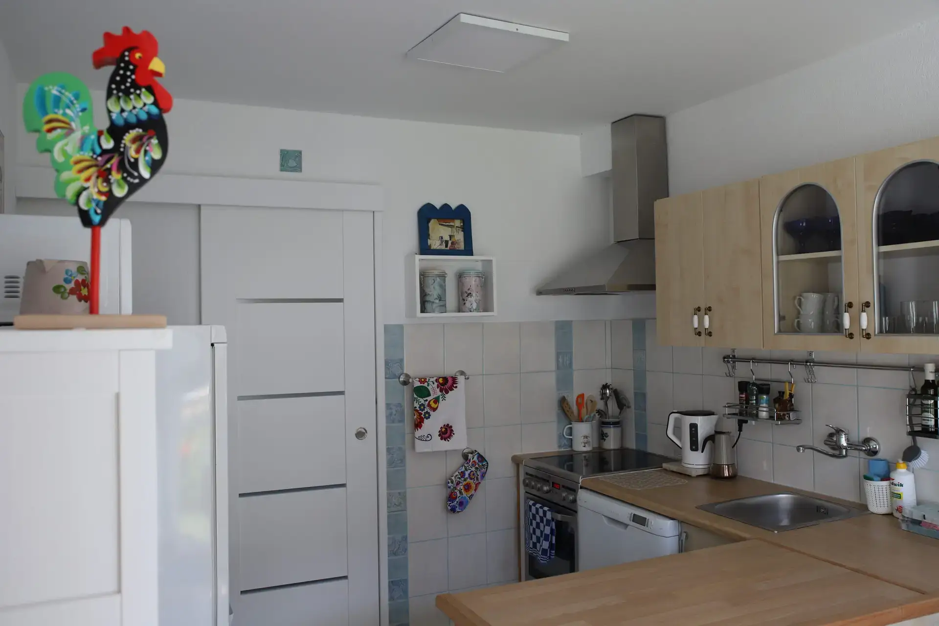 Kuchnia z dużą lodówką i szufladami zamrażarki, zmywarką, kuchenką elektryczną z piekarnikiem, mikrofalówką, ekspresem do kawy, ekspresem do herbaty, sztućcami, naczyniami, patelniami i garnkami dla 8 osób.