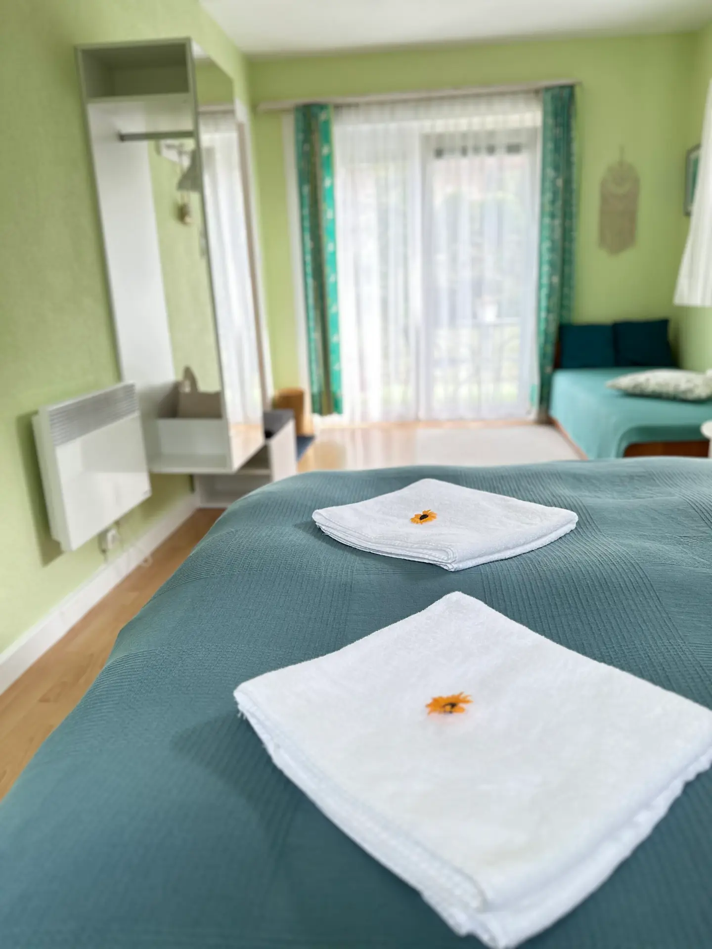 1 łóżko podwójne 160 x 200 cm z nowym materacem, 1 łóżko rozkładane 80 x 200 / 160 x 200), otwarta szafa z lustrem, wyjście do ogrodu. Specjalne rolety okienne do zaciemnienia.