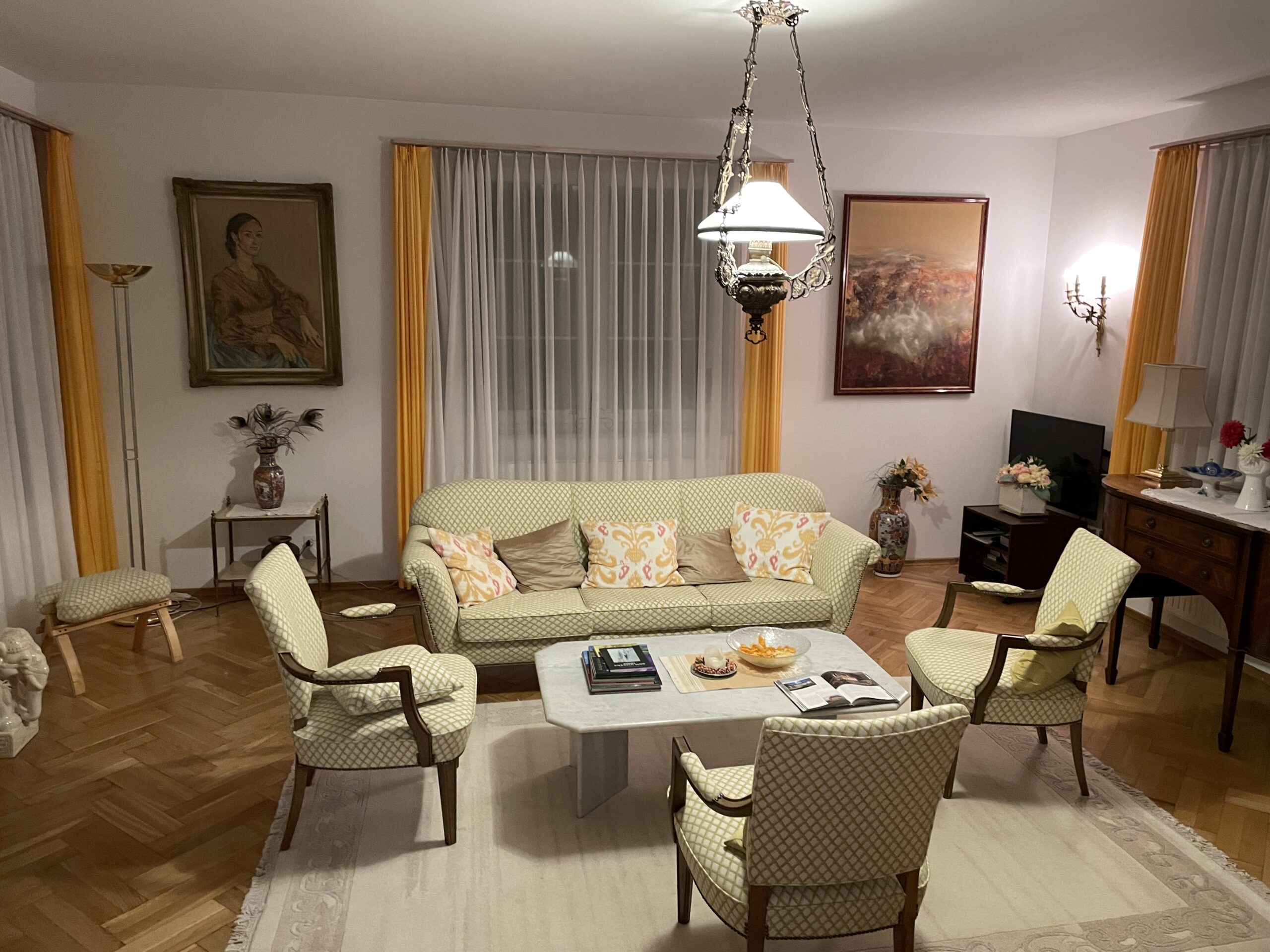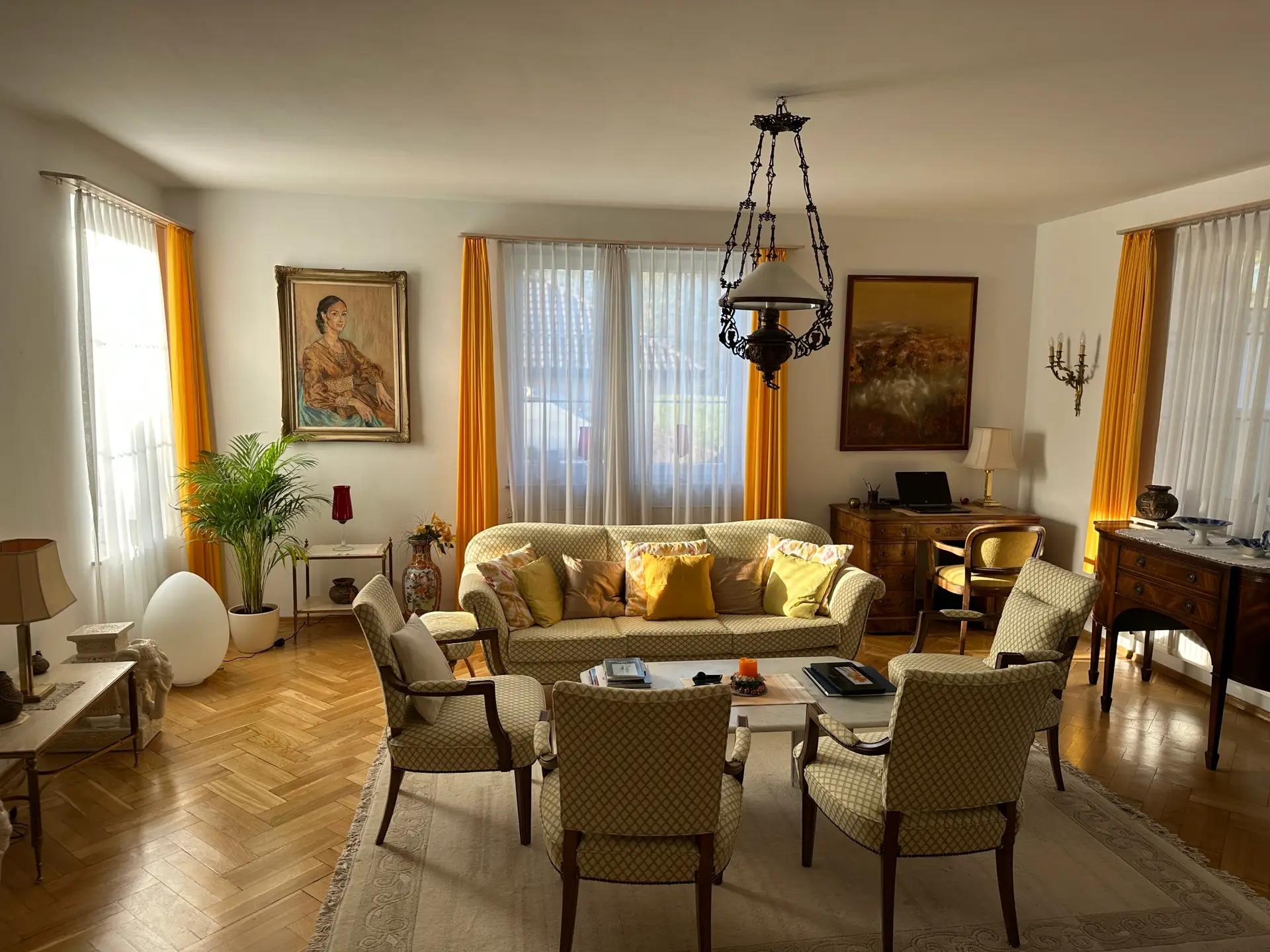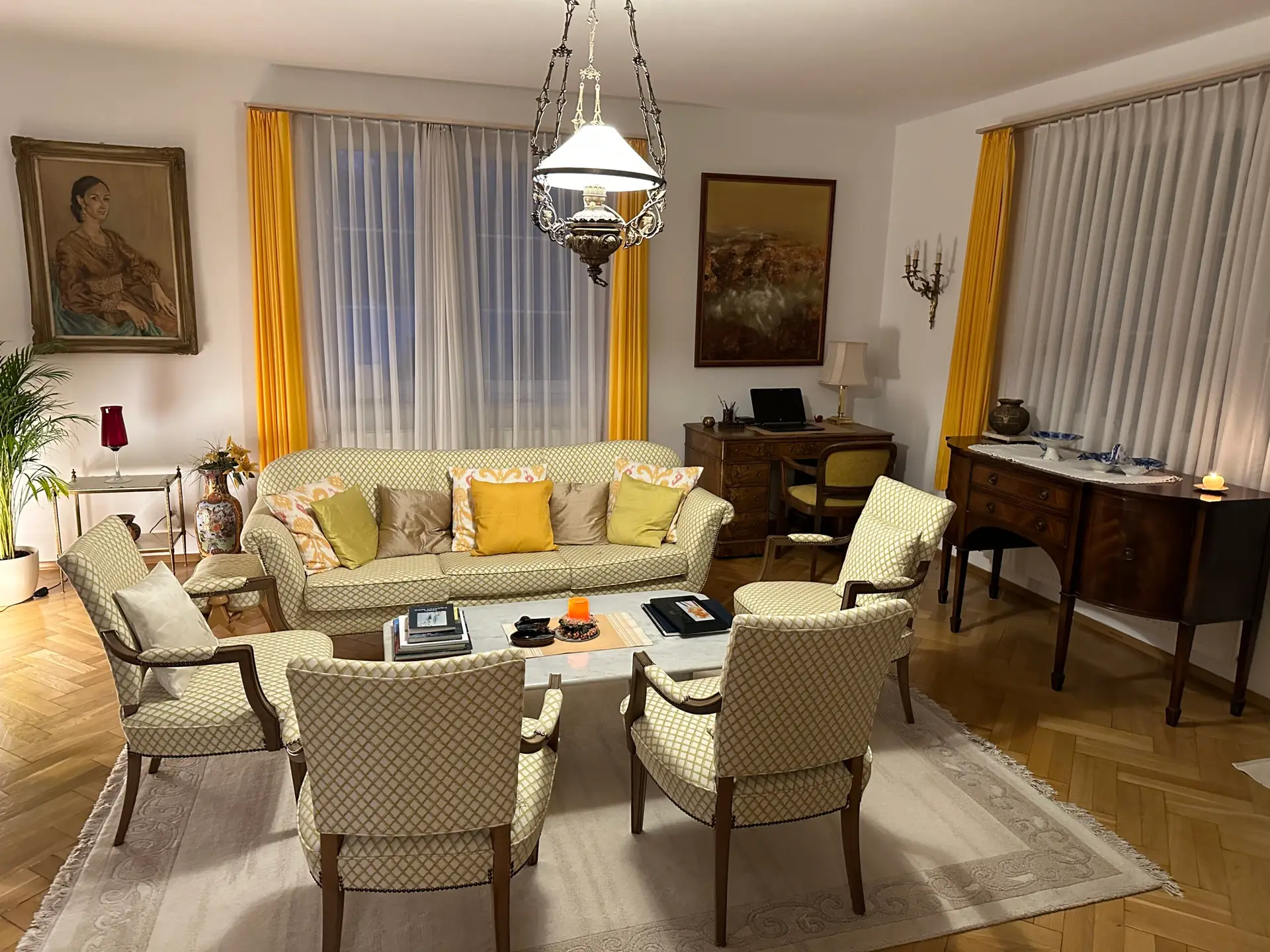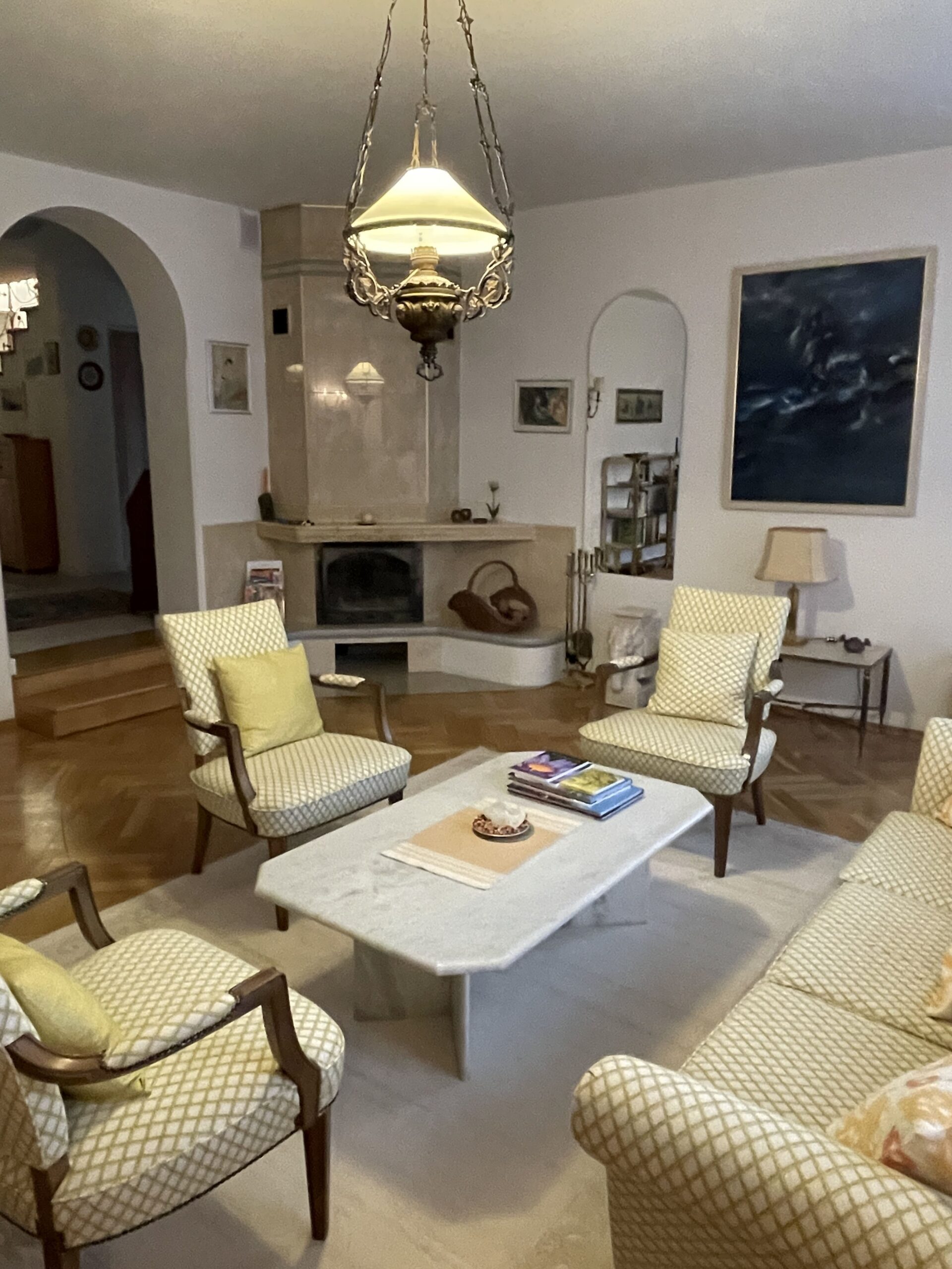 Stylish living room as a cozy salon with fireplace and antique furniture, books – access to the winter garden for quiet moments. Desk with laptop for free use. Large TV. Free internet / WIFI.